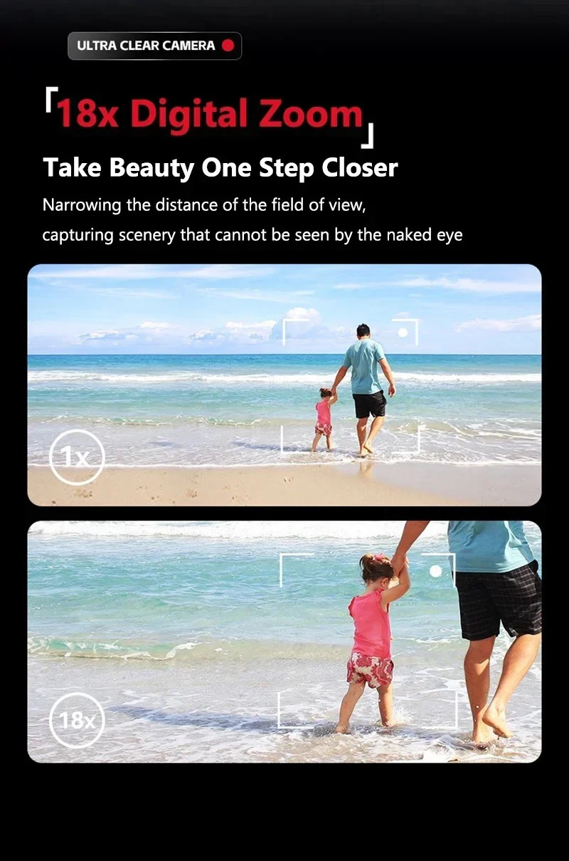 【18x Zoom Photography Camera】This digital camera has a 3-inch screen and 18x digital zoom. When taking photos or recording videos, you can use the W/T button to zoom in or out to capture detailed close-ups or distant objects.